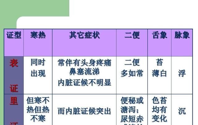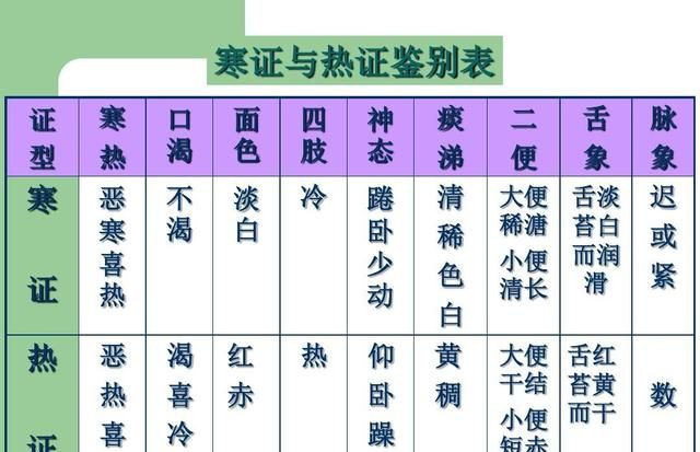表寒,发热无汗,头痛,身痛里寒,腹痛胃痛,手足不温表热,发热咽痛,红肿化脓里热,便秘口干,尿黄舌红。虚寒,乏力犯困,手足不温,舌淡脉弱实寒,遇冷胃痛腹痛,周身痛,拒绝按压,起病急,发病快。虚热,五心烦热,潮热盗汗实热,高热不退,口苦口干便秘阳盛格阴者,表现虽手足冷,里却热以到极点,外冷,却口干舌焦,口唇干枯,津液已经被伤,不要被表象蒙蔽,治疗仍然以清热为主。阴盛格阳者,虚寒为本,而反映出面红头胀,潮热之热象,区别在于膝盖下冰冷,小便多尿频,阳气不化津液的表现就是真相。