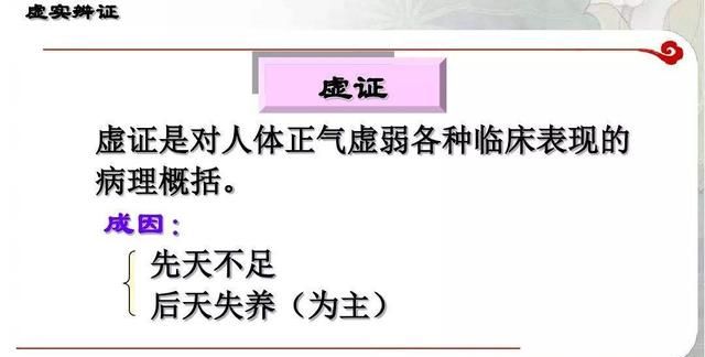 虚证是正气不足造成,例如气血阴阳的不足,脏腑虚弱。表现为乏力,食少,精神不振。