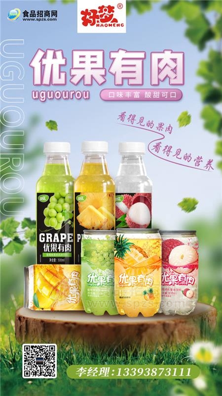 优果有肉果汁,严选水果采购基地原料直采,采用独特工艺低温速冻,口感贴近现制饮品,果汁含量高。保留果肉营养成分,大颗果肉口感独特更有嚼劲,做到真正的纯果汁+真果粒,拉开与同类竞品的差距,是现代饮品趋势之下的健康果汁。