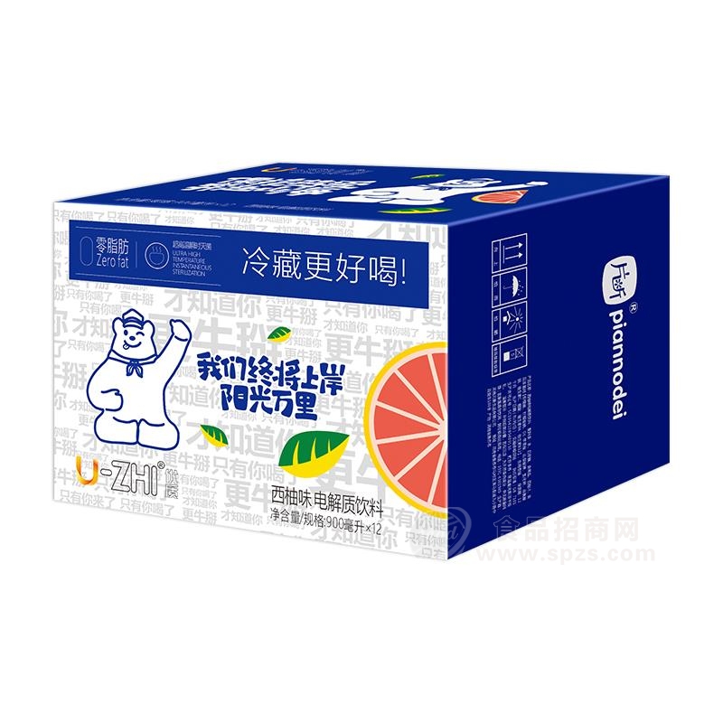 U-ZHI西柚味电解质饮料顺应年轻消费者,入口淡淡的酸,后味微微的甜,口感清新,越喝越想喝!另有U-ZHI柑橘复合果汁饮料、金桔柠檬复合果汁饮料,补充维C,补充水分,酸酸甜甜,自然果香,满足消费者味蕾需求,每一种口味都别具魅力。U-ZHI西柚味电解质饮料蓝白相间,整体大气上档次、年轻化、潮流化!瓶身走心文案”保持热爱,奔赴山海“、”我们终将上岸,阳光万里“必然深受莘莘学子喜爱!陈列摆放立刻吸引年轻人的目光,让人忍不住立刻买单,立马饮用!U-ZHI电解质饮料不仅适合运动后饮用,也十分适宜调整身体状态。运动员、久坐的办公、学习一族,都可以来上一瓶,实现更佳状态!900ml大容量,超高性价比,终端动销更无忧!河南片断食品有限公司