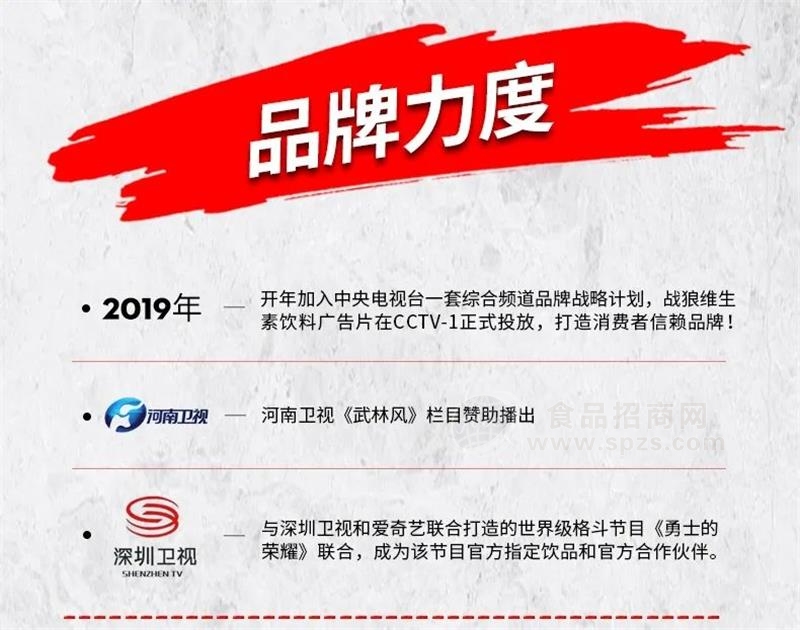 图源:食品招商网设计高速增长的能量饮料赛道“大玩家”扎堆,但相较于品牌,找准需求,直击痛点也同样重要。“战狼”大品牌自带流量,0防腐剂、0色素更贴合消费者需求,实力彰显品质,全国招商火热进行中!图片(注:除已标注图源外,其他图片均来自品牌方)财富热线 谷先生:16619886868