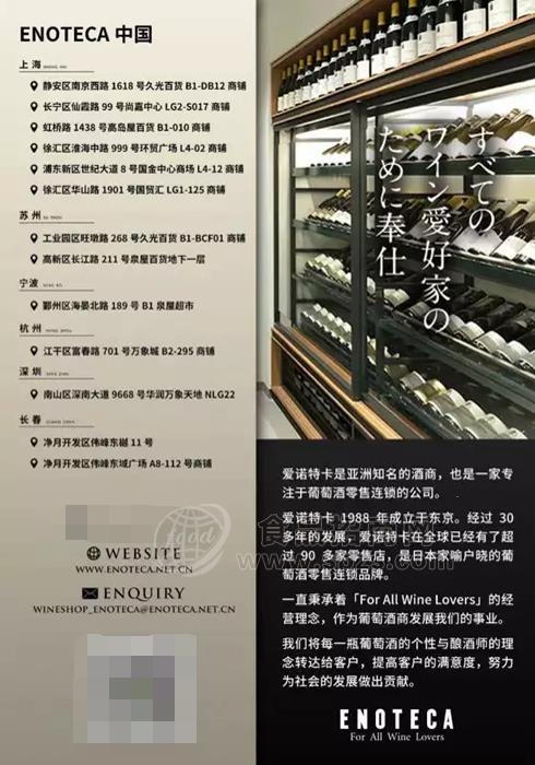 菲卡来了,优雅就来了,生活就来了,我们的故事从这里就开始了。葡萄酒零售业巨头,知名进口商爱诺特卡ENOTECA现在是Achával-Ferrer阿翡罗酒庄的中国代理。ENOTECA品牌创立于1988年,是亚洲知名的葡萄酒进口及零售企业,现在在亚洲市场已经拥有超过百家门店。店铺遍布中国大陆、如中国香港、中国台湾,日本,韩国,新加坡 ,泰国等国家和地区。一直秉持着 “For All Wine Lovers”的经营理念,作为葡萄酒商发展事业。Enoteca将每一瓶葡萄酒的个性与酿酒师的理念传达给客户,提高客户的满意度,努力为社会的发展做出贡献。品鉴菲卡系列珍酿可点击下方 Enoteca 线上商场链接,也可以扫描二维码,或移步Enoteca门店开启这场舌尖上的阿根廷风土旅程。