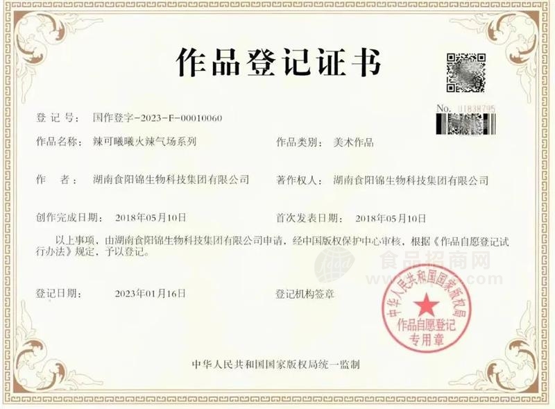 作为网红辣条品牌,辣可曦曦有着自成一派的颜值风格!火辣十足的包装风格加上火气十足的产品名称,让人只闻其名就已经火力十足!还有着作品登记证书,受国家版权中心保护!