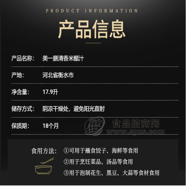 美一膳 清香米醋汁 17.9L/桶17.9L/桶是由山东巧妻食品科技有限公司生产的,是醋知名品牌,山东巧妻食品科技有限公司采用国内外先进的工艺加工技术,并经专家精心调制生产;美一膳 清香米醋汁 17.9L/桶17.9L/桶营养丰富,并能增加菜肴色泽及香味,风味口感更佳。现面向全国各地诚招代理商。