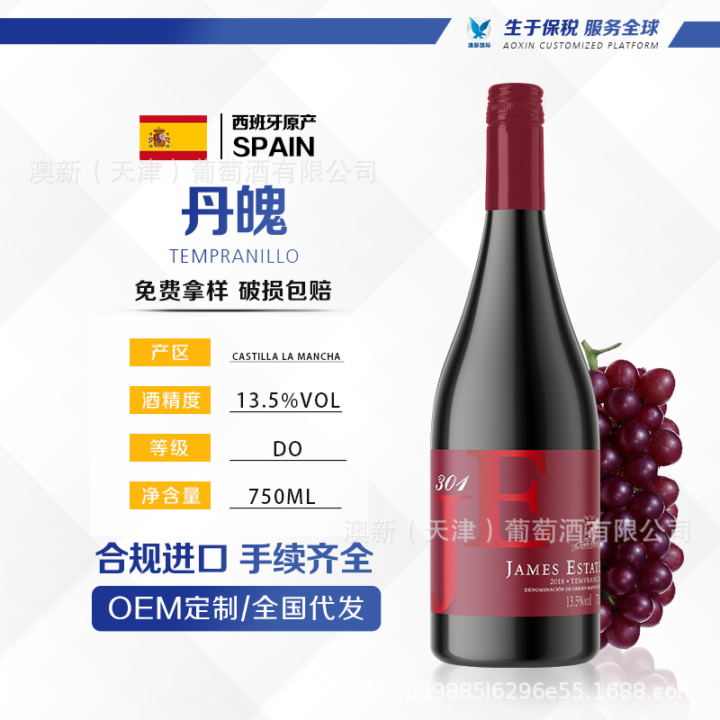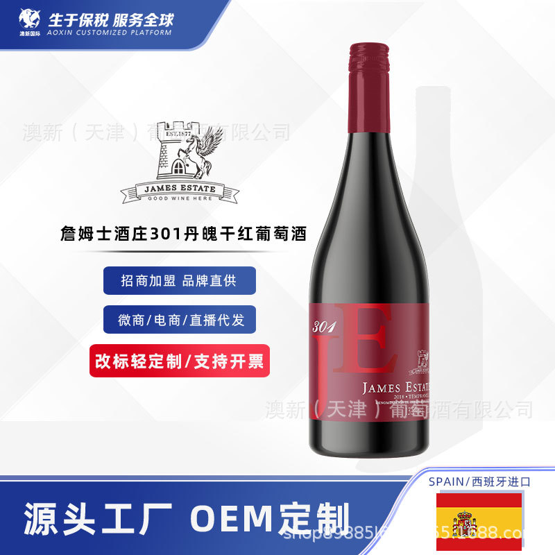 西班牙进口红酒詹姆士酒庄301丹魄干红葡萄酒批发贴牌定制代发