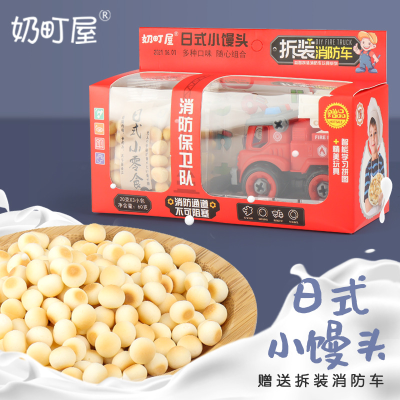 新品儿童蛋黄味小馒头带可拆卸消防车工程车警车系列玩具零食批发