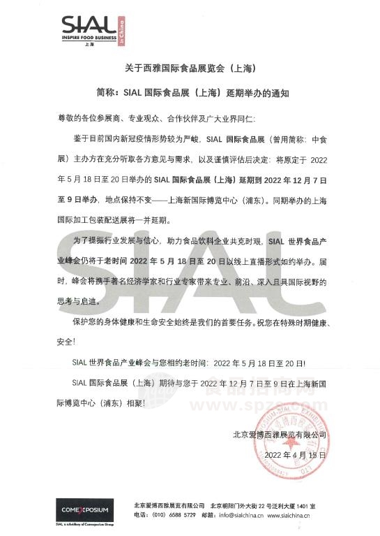 - 关于SIAL国际食品展(上海)延期到2022年12月7日至9日举办的通知