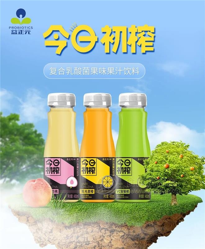 「益正元今日初榨果汁」精选原料,50%果汁含量包装设计大气上档次,400ml大瓶装满足聚餐、宴席、送礼等诸多场景深受各个年龄阶段的消费者喜爱