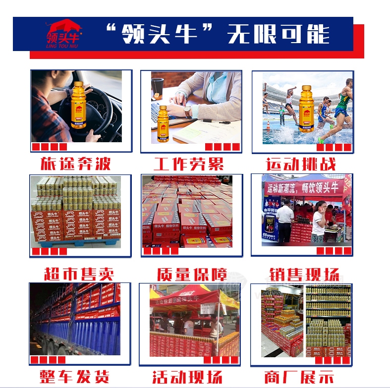 旅途奔波来一瓶、工作劳累来一瓶、运动挑战补充能量,日常开车提神醒脑,领头牛维生素运动饮料,消费场景丰富,拥有无限可能,适合在商超、夫妻店等销售,更适合在加油站、火车站、餐饮等深入布局,渠道广动销快。