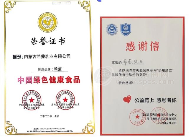02 市场和业界的广泛认可,着重打造知名度,树立品牌形象内蒙古希蒙乳业有限公司认真花费时间和财力打造企业品牌,在多年生产经营过程中逐步建立品牌影响力,拥有良好品牌知名度。在各种活动评比中曾获得“泉鼎奖”“中国绿色健康食品”等荣誉,其2022年被评为“中国知名品牌”,综合口碑优秀。内蒙古希蒙乳业有限公司还有着民族大爱,在大灾大难面前有做作为,踊跃捐款捐物驰援河南防汛救灾。