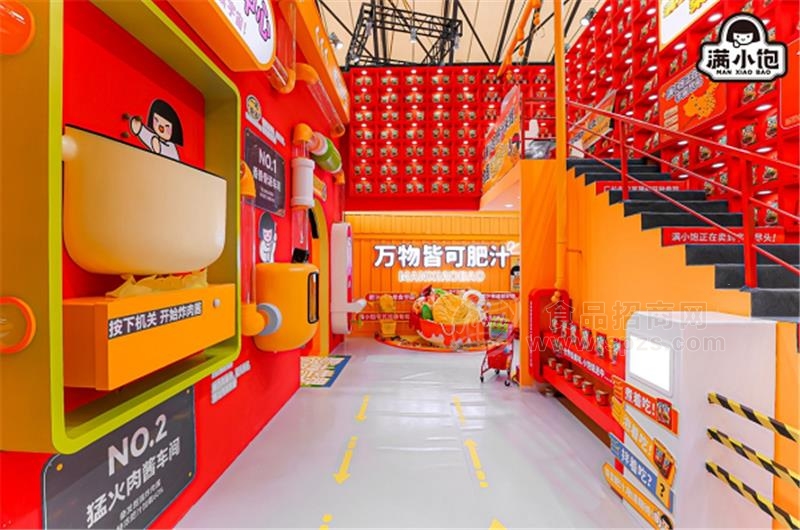 据了解,满小饱此次参展并未采用单一的产品展示模式,而是围绕“肥汁”主题,打造了一个既创意十足又诚意满满的梦工厂主题馆。展馆营造了可爱风的梦工厂奇幻世界氛围,主打超亮眼的红橙色系,由超高的2层6.5米集装箱构成,也是展会一区内唯一一个搭建2层的展厅。满小饱展馆外部的每一面都很有料,包括大肥汁倒出小肥汁的彩虹打卡墙、在管道中输送的产品陈列墙、肥汁总控室和香香试吃间,展馆内部则设置了肥汁宇宙研发中心、甜醋汁试验室、干椒粉试验室、万物皆可肥汁、肥汁大冒险等多个主题区域。观众不仅可以通过互动装置了解肥汁米线“一吊骨汤、二炸肉酱、三煲肥汁”的经典工艺、坐进超大碗肥汁米线中拍照打卡,还能玩肥汁梦工厂主题大富翁、扭蛋机赢奖品、抓厂长拍照等趣味互动游戏,获得超大肥汁米线编织袋等好礼。