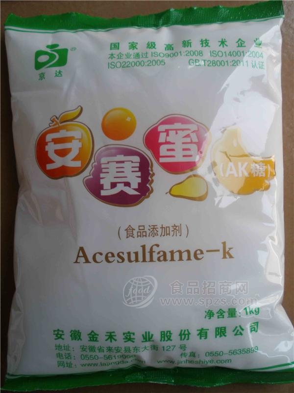安赛蜜是一种食品添加剂,易溶于水。口感好,无热量,具有在人体内不代谢、不吸收(是中老年人、肥胖病人、糖尿病患者理想的甜味剂),对热和酸稳定性好等特点,是目前世界上第四代合成甜味剂。它和其它甜味剂混合使用能产生很强的协同效应,是目前世界上稳定性*好的甜味剂之一,在空气中不吸湿,对热稳定。能耐225℃高温,在PH2~10范围内稳定,使用时不与其它食品成分或添加剂发生反应。适用于焙烤食品和酸性饮料。甜味纯正而强烈,与阿斯巴甜1:1合用有明显增效作用。