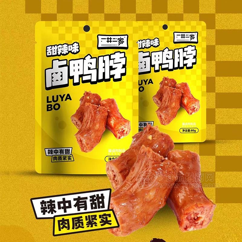 一井二家甜辣味袋装卤鸭脖休闲食品80g是由河南一井二家食品有限公司生产,是肉干肉脯知名品牌,河南一井二家食品有限公司采用国内外先进的工艺加工技术,并经专家精心调制生产;一井二家甜辣味袋装卤鸭脖休闲食品80g营养丰富适合中国人体质和饮食习惯,现面向全国各地诚招代理商。