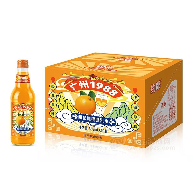1、约郞广州1988甜橙味果味汽水饮料招商玻璃瓶358mlx20瓶经销商必须有经营销售能力。