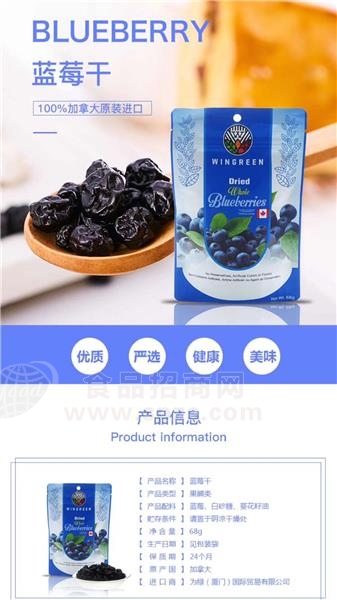 进口 蓝莓干是由厦门为绿贸易有限公司生产,是进口干果知名品牌,采用国内外先进的工艺加工技术精心生产;进口 蓝莓干营养丰富,品质上乘,现面向全国诚招代理商。