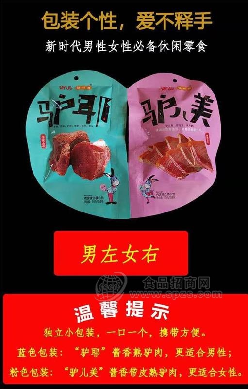 驴耶产品与驴儿美为同一系列产品,为酱香驴肉产品,驴耶更适合男性食用,包装为绿色包装,驴儿美更适合女性消费者,高胶原蛋白,包装为粉色;内含5个小袋包装,一口一个更卫生更个性;