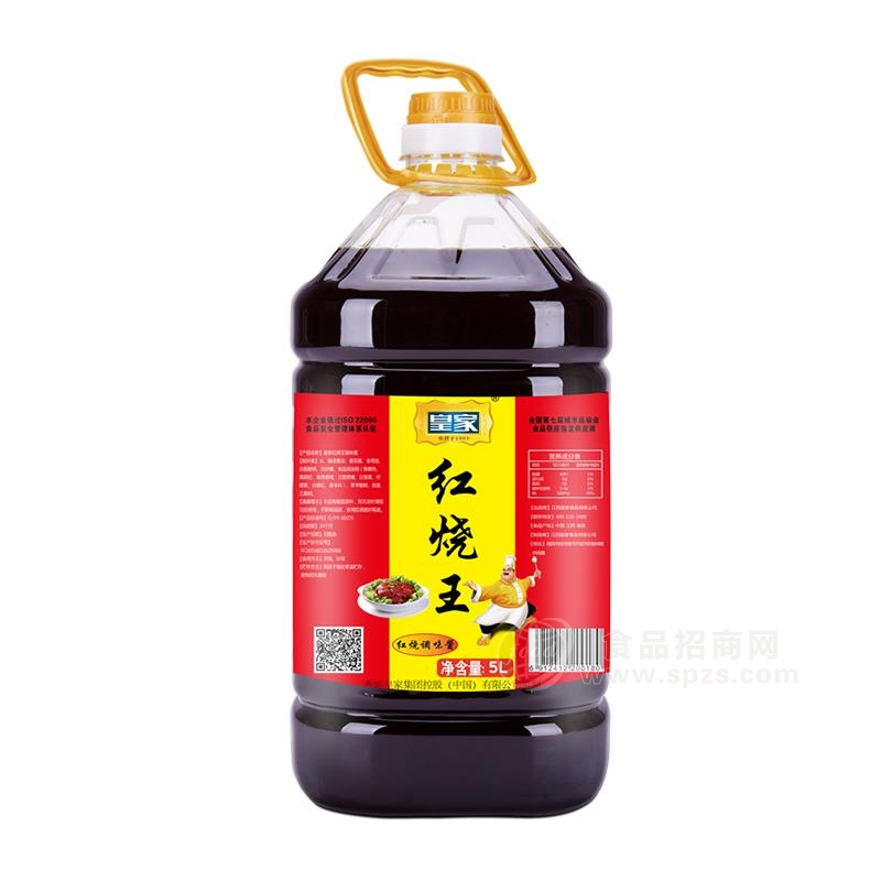 皇家调味品酱油红烧王调味品瓶装5L是由江西皇家食品有限公司生产的,是酱油知名品牌,江西皇家食品有限公司采用国内外先进的工艺加工技术,并经专家精心调制生产;皇家调味品酱油红烧王调味品瓶装5L营养丰富,并能增加菜肴色泽及香味,风味口感更佳。现面向全国各地诚招代理商。