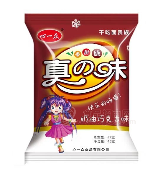 心一众干吃面奶油巧克力味干脆面是由河南心一众食品有限公司生产,是干脆面知名品牌,河南心一众食品有限公司采用国内外先进的工艺加工技术,并经专家精心调制生产;心一众干吃面奶油巧克力味干脆面营养丰富适合中国人体质和饮食习惯,现面向全国各地诚招代理商。