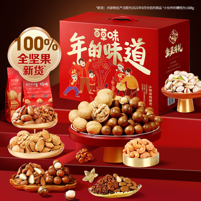 关键词:【百草味】坚果零食礼盒D1-1688g小伙伴的鞭炮春节坚果大礼包,供应,烘焙|膨化|糖,烘焙食品,糕点