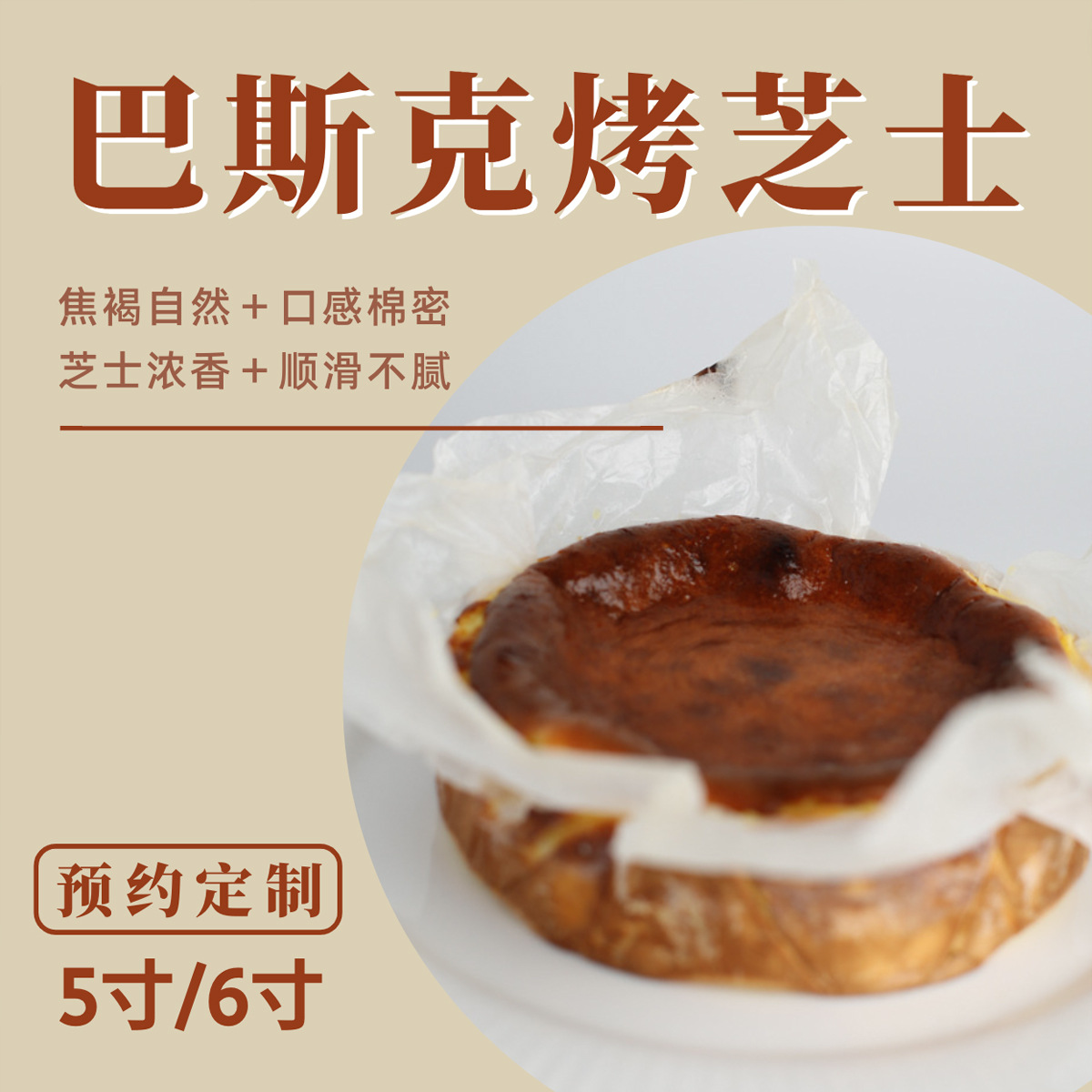 当前位置:首页>>供应>>烘焙|膨化|糖>>烘焙食品>>糕点>>巴斯克烤芝士蛋糕 5寸/6寸可定制 口感细腻丝滑 下午茶
