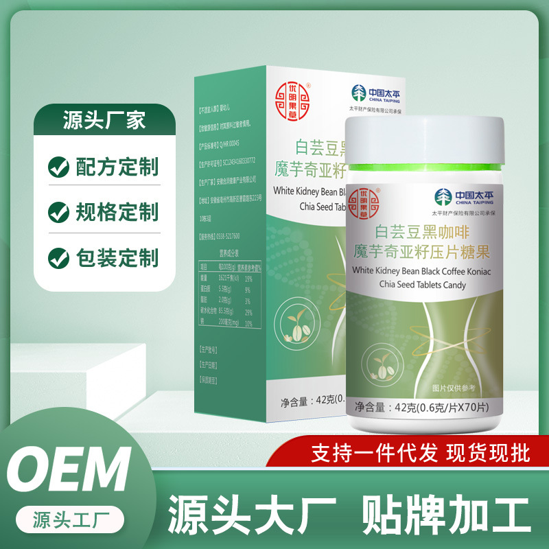 白芸豆黑咖啡糖果 源头厂家魔芋奇亚籽压片糖果 优眀果草厂家批发