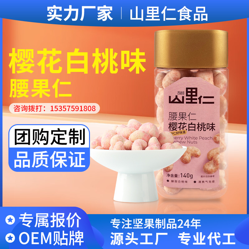 关键词:【定制】罐装腰果仁樱花白桃腰果仁气泡风味坚果零食OEM代加工,供应,零食,休闲食品,腰果
