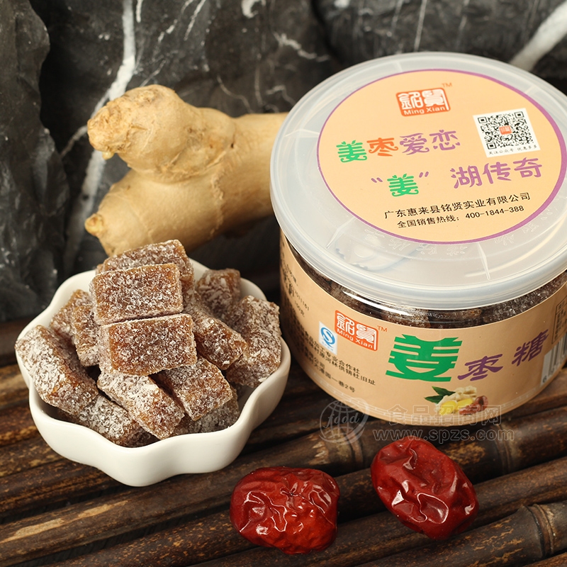 姜枣糖由生姜,红枣,红糖,椰丝精制而成。取一颗姜枣糖含于口中,10秒后,姜、枣味争相溢出,充满口腔,再慢慢吞嚼,绵软又不失嚼劲,回味无穷,又想再来一个!姜枣糖由有30多年工艺的老师傅主理,精取生姜汁,将红枣去核搅碎成泥,红糖为粘合,制成甜而不腻,姜辣味适口,枣香味浓郁的姜枣糖。中医称,红枣润而姜母暖:红枣性味甘温,有补中益气,养血安神之功效;生姜夏天能祛湿,冬天能祛寒,又能缓解肠胃疾病。相彰得益!铭贤“姜枣糖”纯手工制作,不含添加剂。为您的健康谱写一曲姜枣爱恋的“姜湖传奇”!