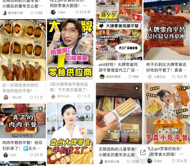 如今,在众多热门社交平台上,“平替好物”已成为热门标签、流量密码,小红书“平替”测评笔记多达119万+篇,饮品、卤味、雪糕、薯片、蛋糕、辣条等休闲零食应有尽有。网友心中已形成一个共识,一个产品如果被打上某大牌平替的标签,就代表着它的原料成分、制作工艺、口感味道、使用体验等方方面面都经得起考验,并经历过了电商、社交平台多方比价,性价比满分。*为消费者认可的平替选项之一就是“大牌背后的代工厂”,同一个工厂生产的东西,从品牌方渠道卖出的是高档货,代工厂自有品牌卖的是平价货。而“平价货”因无需花费广告、明星代言等营销费用,且产业链完整度比较高,能进行成本管控,所以价格只要原先的2/3,甚至1/2,消费者纷纷为之疯狂。Z世代跟随互联网一起发展,能够熟练使用各种网络资源,找到一个平价代替、代工厂是一件再简单不过的事。隐匿于网红品牌背后的代工厂、源头商纷纷被年轻人扒了出来,各个平台关于零食平替种草贴均有数十万播放,数万的收藏。