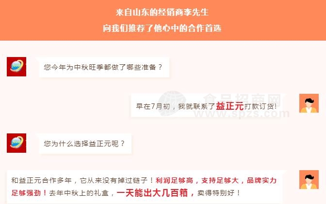 那么,益正元凭何,成为经销商投资合作的首选?01凭颜值高红红火火、喜气爆棚的外包装,将中国传统节日团圆喜庆的氛围瞬间拉满无论是送亲友,还是送长辈,都倍有面子!凭品质高真材实料的品质,比其他中秋礼品更加健康!畅销品类应有尽有,媲美网红品牌的食用体验感,让产品市场复购率更高。02凭性价比高超高的性价比就是益正元决胜市场的杀手锏!更加亲民、接地气儿的价格,让消费者花更少的钱,送更好的礼。03凭品牌知名度高中秋送礼佳品,大品牌更值得信赖。益正元产品自带明星流量,市场终端销售火爆。04凭渠道多产品主攻线下渠道,锁定流量巨大的夫妻店、商超,以及规模不断扩张的社区团购等,避开线上强势品牌,迅速布局全国。05凭合作门槛低知名品牌可能就意味着较高的合作门槛,但益正元对经销商合作方面的资质要求非常合理!不会盲目测算市场容量,制定订货、铺货节奏。而是整合经销商现有的团队、渠道优势,做产品导入,分步骤、按阶段的运营推广方案十分接地气。06凭支持力度大益正元配备有专业团队,辅助经销商进行市场开发和产品铺市,打造样板,让产品迅速占领市场;还为经销商提供*低的出厂价,*大程度确保经销商的利润空间。