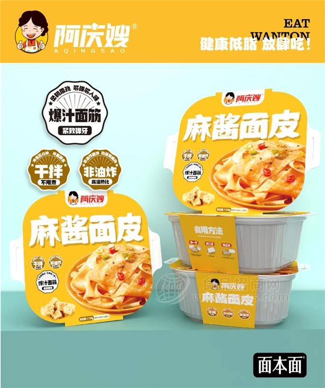麻酱面皮同样美味,上等芝麻酱香飘十里,吸足酱汁的面皮宽窄合适,吃一口顺滑筋道,“非油炸”工艺凸显健康性,给足消费者购买理由。