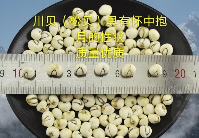 ①松贝:川贝母中质量最好的一种,外形为圆锥球形,直径不超过1公分,外皮白色,略显淡黄,味道甘润,微苦。由两瓣鳞片组成,一大一小,大瓣呈元宝状包绕小瓣,小瓣呈条状,类似半月形,中药鉴别习称为“怀中抱月”,这是松贝外形最大的特点,也是人们鉴别松贝的主要观察部位。