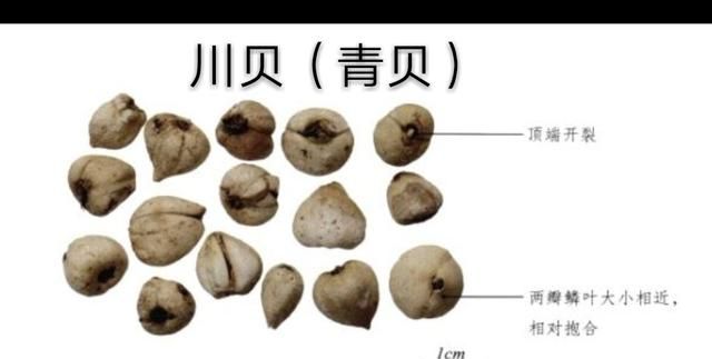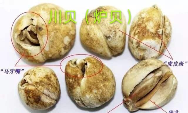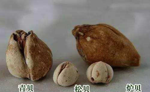 ②青贝:类似球形,略扁,直径比松贝略大,颜色白中泛黄。鳞片两瓣,大小基本接近,顶端开裂。青贝的药用价值略低于松贝,价格也便宜许多。③炉贝:外形类似栀子,呈现圆锥形,略长,形似马的牙齿,具有“马牙嘴”的特点。颜色较松贝深,淡黄色,外皮具有黄色斑点,称为“虎皮斑”,这是炉贝的外形特点,也是区别于其他贝母之处。