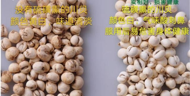 劣:所谓劣质川贝一般有两种情况一是个别人为了让川贝颜色白,卖相好,使用硫磺熏蒸川贝,经过硫磺熏蒸的川贝,虽然颜色光洁而白,但具有明显的刺鼻酸味,药效也下降许多,注意,硫磺熏蒸的川贝对人体健康有一定的危害,如果长期过量的使用可出现胃肠功能紊乱,神经受损等问题。