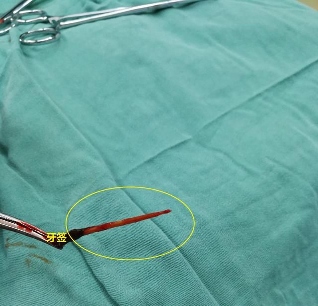 后来开刀进去,还真给取了一根染血的牙签出来。牙签经过一晚上,已经排到了大肠,且把大肠扎破了。