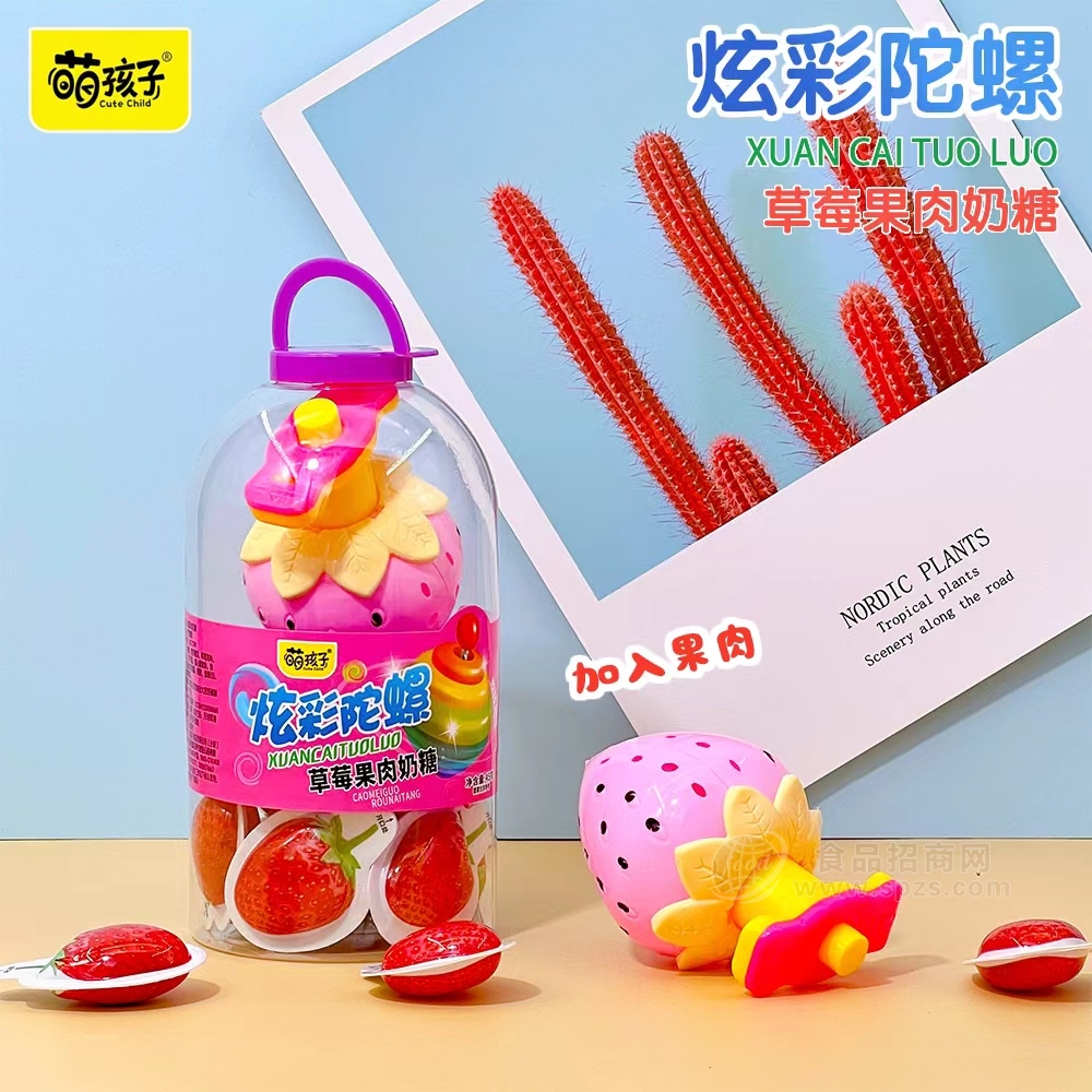 在消费升级的趋势下,传统的糖果早已被市场抛弃,内在好吃健康,外在个性时尚的新式糖果才能真正满足需求。萌孩子炫彩陀螺奶糖,特别加入果肉,吃糖的同时还能吃水果,既健康有美味。同时,产品采用3D造型,草莓、椰子、榴莲、百香果、芒果,五种水果,精致有趣,深受孩子们的喜爱。