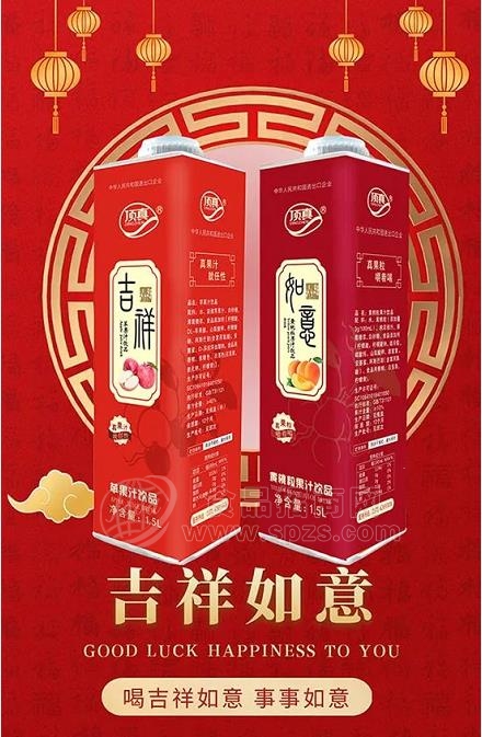 在包装上,顶真1.5L吉祥如意果汁完全符合宴席场景市场的高颜值审美观点,红色中国风设计,情系爱情矢志不渝,采用了更为环保高端的纸盒装,摆在桌上不仅显档次,还能够烘托现场气氛,!